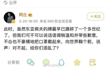 在疫情期间,不知道大家是否还记得原央视主持人阿丘曾在社交媒体上发过这样一段话,他说,虽然我们不再是东亚病夫,但是我们可不可以将说话的语调变得温柔并带些歉意。把口罩戴起来,然后向世界鞠躬,说声对不起。 在这篇文章发表不久之后,钟南山院士表示,病毒不一定起源于中国,我们没有理由道歉,而如今越来越多的证据都表明,钟南山院士说的是正确的,我们没有任何理由向全世界道歉,病毒也不一定就起源于中国。如今我国的疫情得到了一定程度的控制,完全是医护工作者和全国人民上下齐心努力得来的。 2020年3月3日,著名时政评论员邱毅发布视频称:“阿丘应该向所有的中国人道歉,因为中国也是此次疫情的受害者,虽然在武汉爆发,但是疫情的根源不一定在中国,也有可能是在美国啊!为什么要让中国道歉?” 邱毅思路清晰,句句都在要点上,批评阿丘批评的有理有据。现在疫情全球爆发,在没有弄清疫情的根源来自哪之前,一个知名主持人凭什么呼吁中国向世界道歉呢?