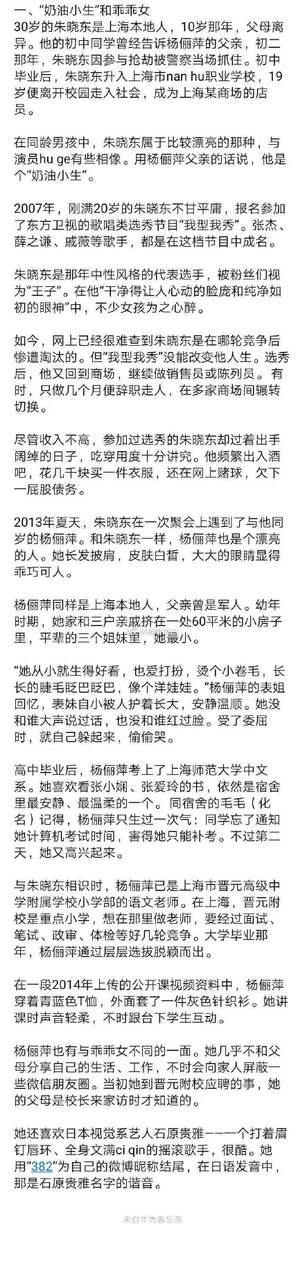 杨丽萍从小娇生惯养,可能时常会对朱晓东无理取闹,而据了解,朱晓东是一个控制欲很强的人,2015年、2016年被发现了出轨的迹象。第一次出轨后朱晓东写了保证书:如果有,烧炭,在家里,一起死。两人其实一直以来争吵不断,也因此想过离婚,甚至都一起去了民政局,但不知道为什么最终没离成,更让人意外的是还酿成了悲剧,网上关于朱晓东杀害杨丽萍有很多不同的声音,有说是蓄谋已久的,在杀害妻子之前有买杀人书籍,另外还带自己去辞职,买冰柜等等,掐死妻子之后,他还各种逍遥,甚至与其他女性开房……网上有传闻说朱晓东还参加过东方卫视的一档选秀节目《我型我秀》,不知道是不是真的,网上有相关的照片,不过这些都不重要了。 在妻子被杀之后,朱晓东将杨丽萍的支付宝丈夫45000元转到了自己的账户,后来买机票前往韩国旅游,还与朋友在酒吧狂欢,不过无论去哪他都随身携带妻子的手机,先后前往南京、海南、徐州、南昌、无锡、韩国首尔等地旅游,透过微信,杨丽萍的家人以为她真的是一直在为旅游。
